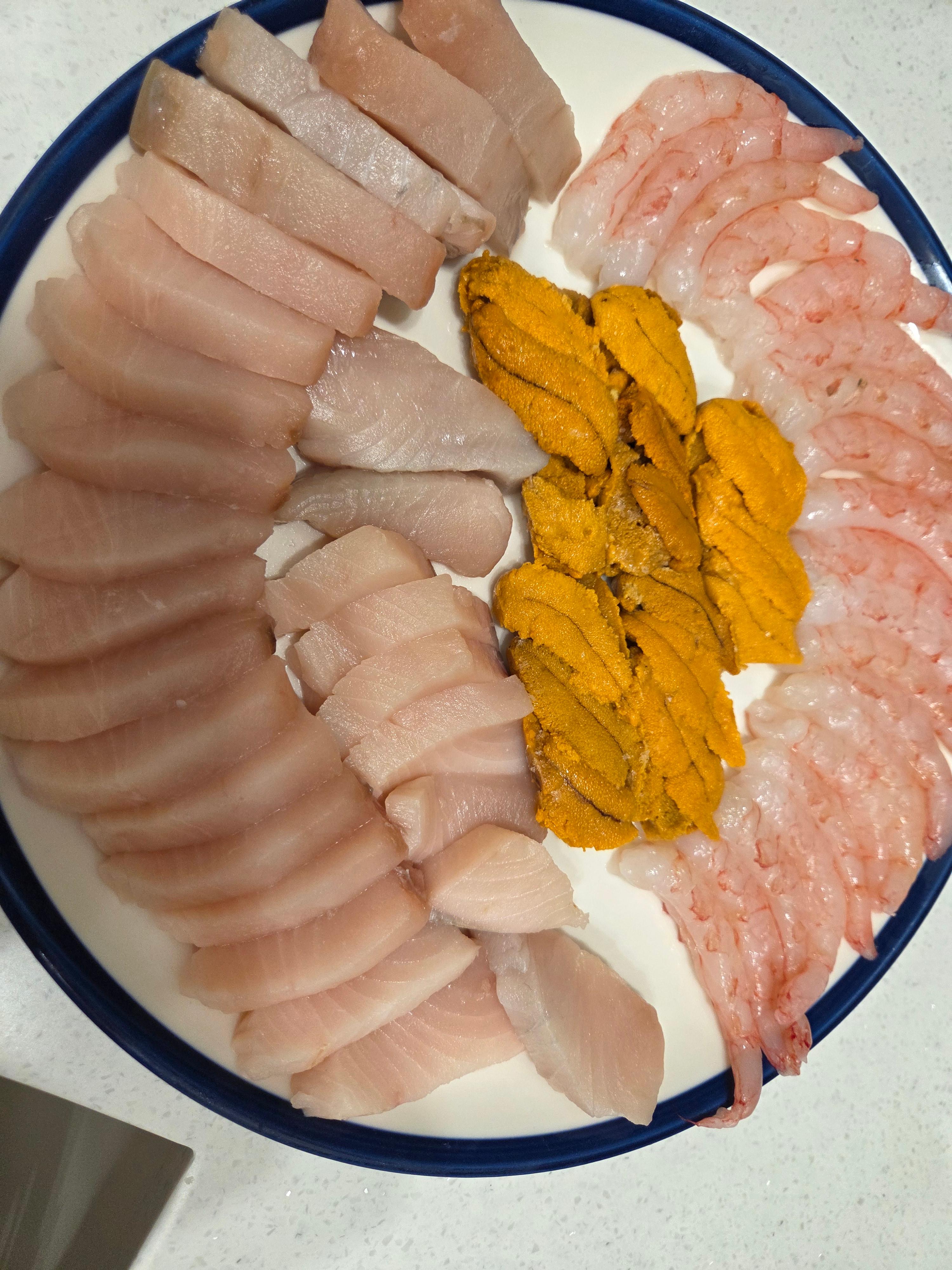 훈훈수산 페루산 냉동우니입니다. 17,800원쯤에 구매했는데 구매해서 냉동보관하셨다가 하루정도 냉장보관해서 드시면 솔직히 저가 오마카세보다 나은정도의 퀄리티를 보실 수 있습니다. 양은 둘이서 먹으면 '와 나 이렇게 성공했나..?' 라는 느낌이고 넷정도서 먹으면 '아쉽지만 요정도면 혈중 우니농도는 다 채웠다' 라는 느낌을 받으 실 수 있는 양입니다. 최종적으로 플레이팅 한 사진 보여드리겠습니다.